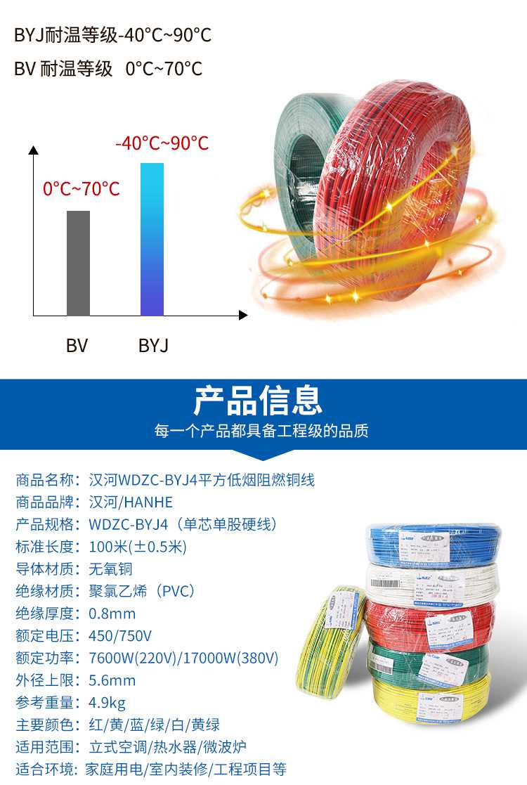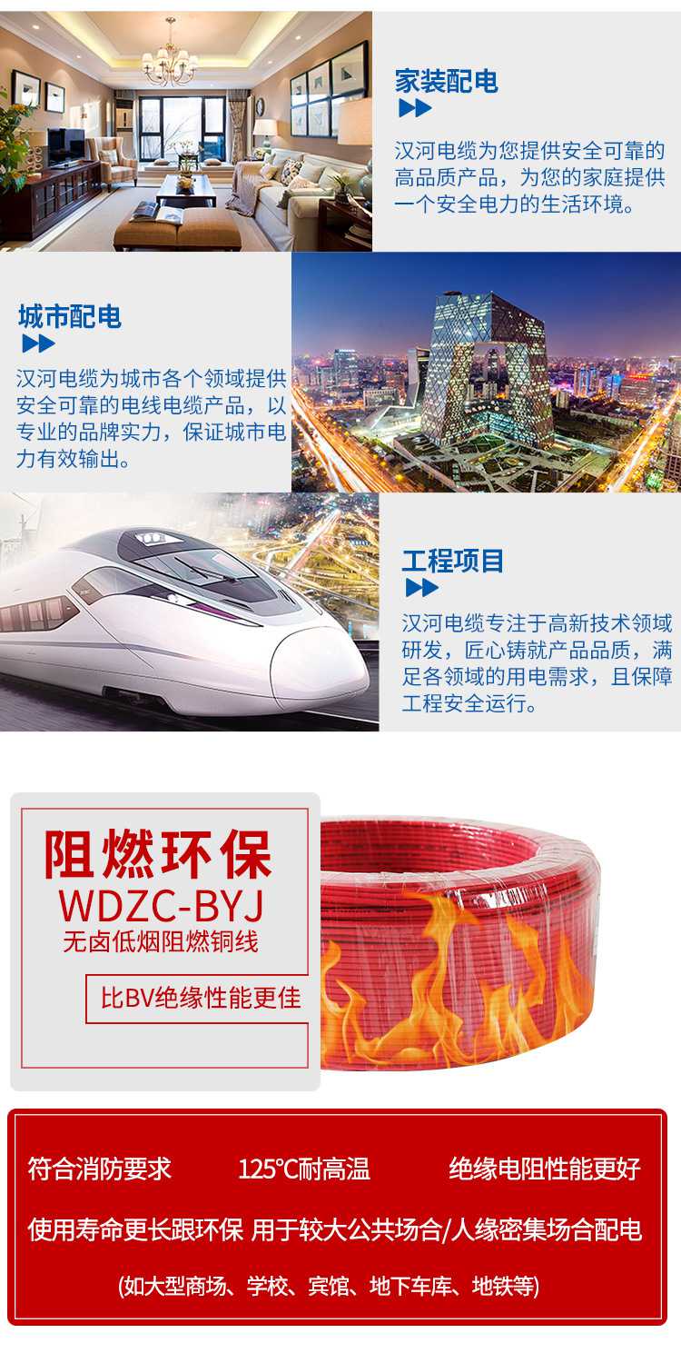 汉河电线低烟无卤阻燃C级电线WDZC-BYJ4mm²家装商业消防用线