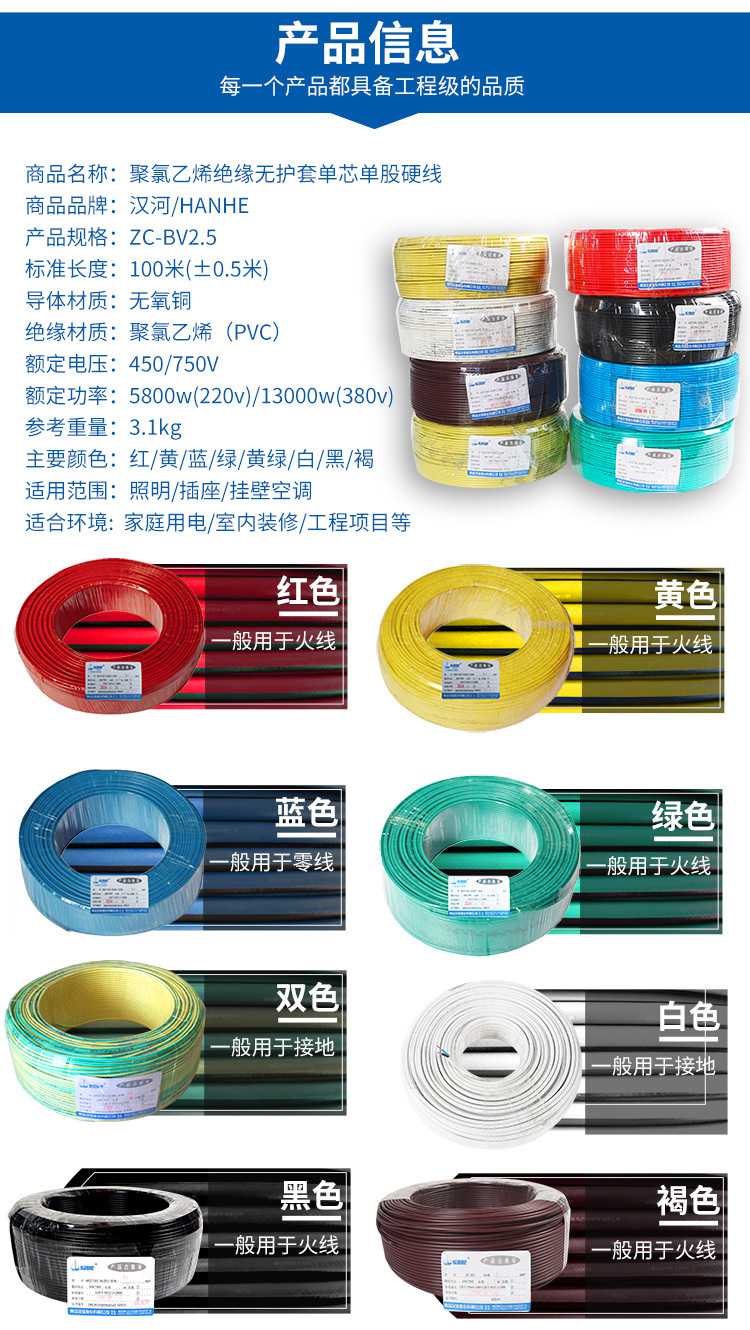 汉河电线电缆ZC-BV2.5平方 铜芯国标家装电线 单芯单股硬线足米